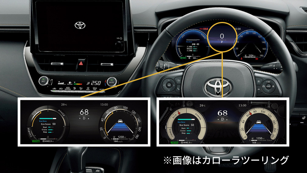 12.3インチTFTカラーメーター+マルチインフォメーションディスプレイのデフォルト4デザインに加え、トヨタアップグレードセレクション限定の、フォントなど細部までこだわった個性的な2デザインを追加。