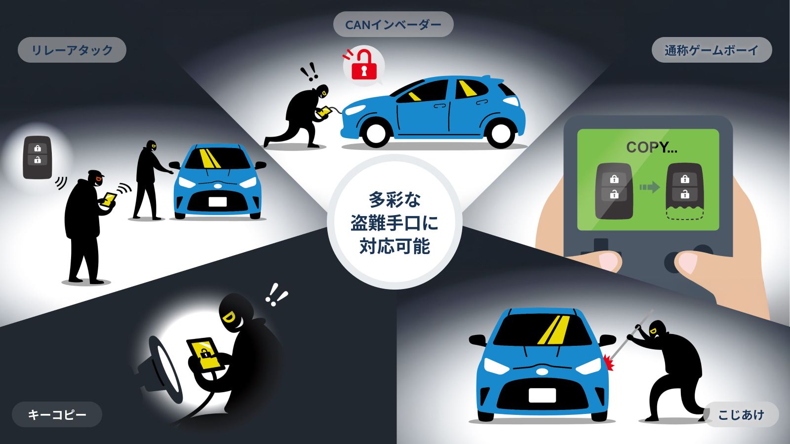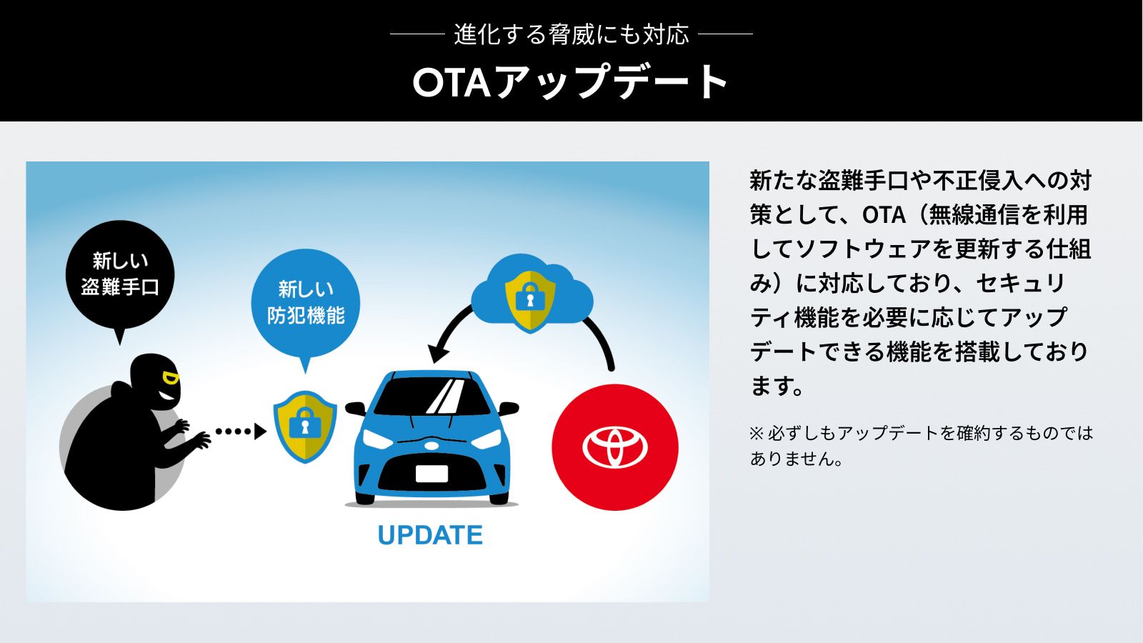 アルファード・ヴェルファイア(2023~)に後付けできる、スマートフォンと連携する利便性と将来の「進化」(OTAアップデート)に対応したセキュリティシステムです。 一括管理できる専用アプリで愛車の安心をスマートに見守ります。 ※こちらはトヨタ純正用品リモートスタート未装着車向けの商品です。 愛車を守る3つのポイント ・正規キーでもエンジン始動を防ぐ「エンジン始動ロック」:CANインベーダーやリレーアタックといった手口に対し、正規のキーを所持していても、専用スマホアプリでの認証(または車両ボタンでのPINコード認証)がなければエンジンを始動させません。 ・侵入者を退ける「音声威嚇」:不正な侵入を検知すると、専用スピーカーから音声を発し、犯人を威嚇します。 ・オーナーへ知らせる「スマホプッシュ通知」:警戒中の乗車(ドアロック解除もしくはエンジン始動)を検知すると、Bluetooth®通信範囲内のオーナーのスマホアプリへプッシュ通知します。 トヨタのメーカー保証が付くことに加え、取付をトヨタ販売店で行うため、安心してお使いいただけます。 本WEBサイトからお申込みいただくことで、取付工賃込みの専用価格にてご提供いたします(※価格は、税込、部品代、工賃込み)。