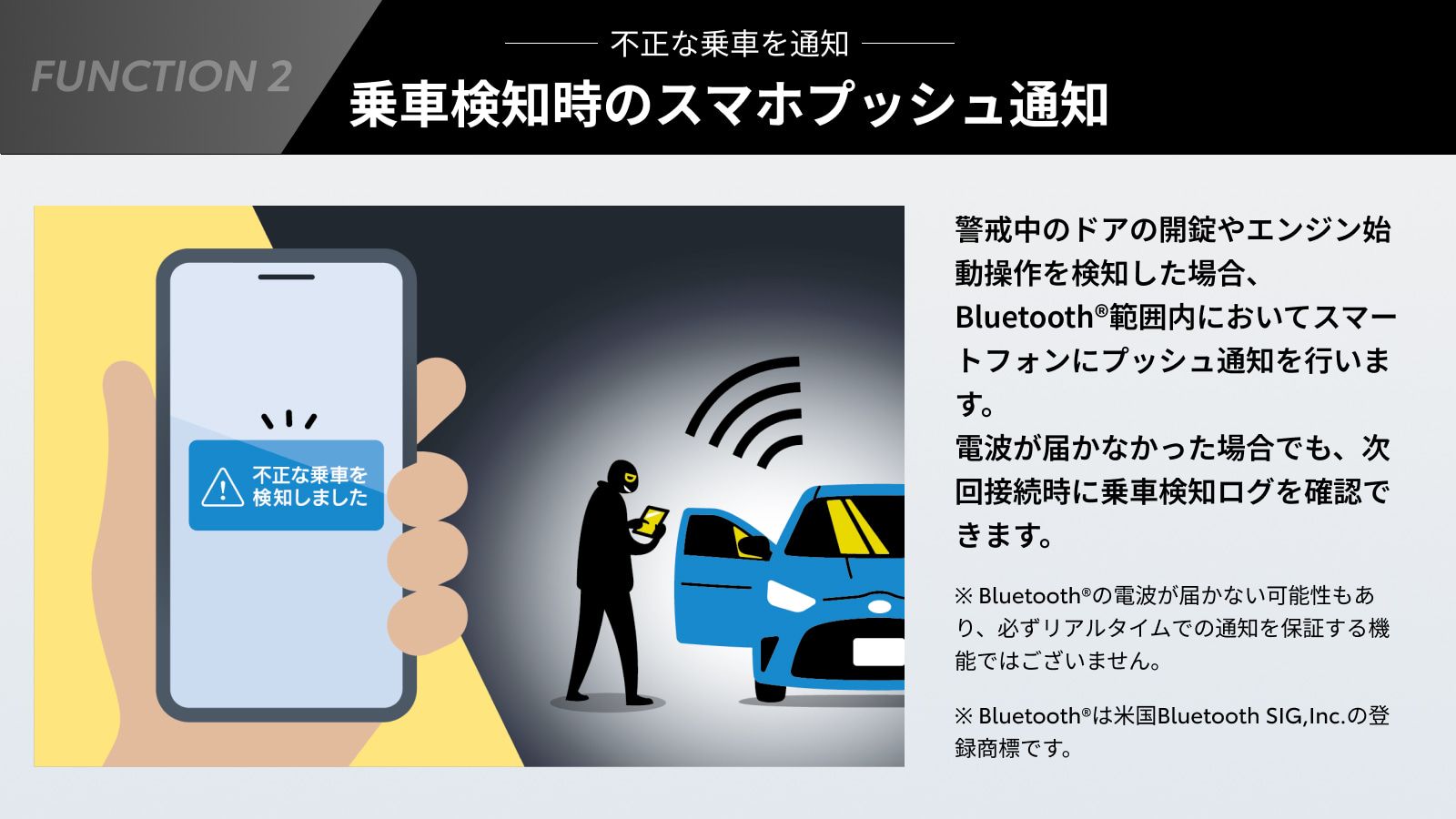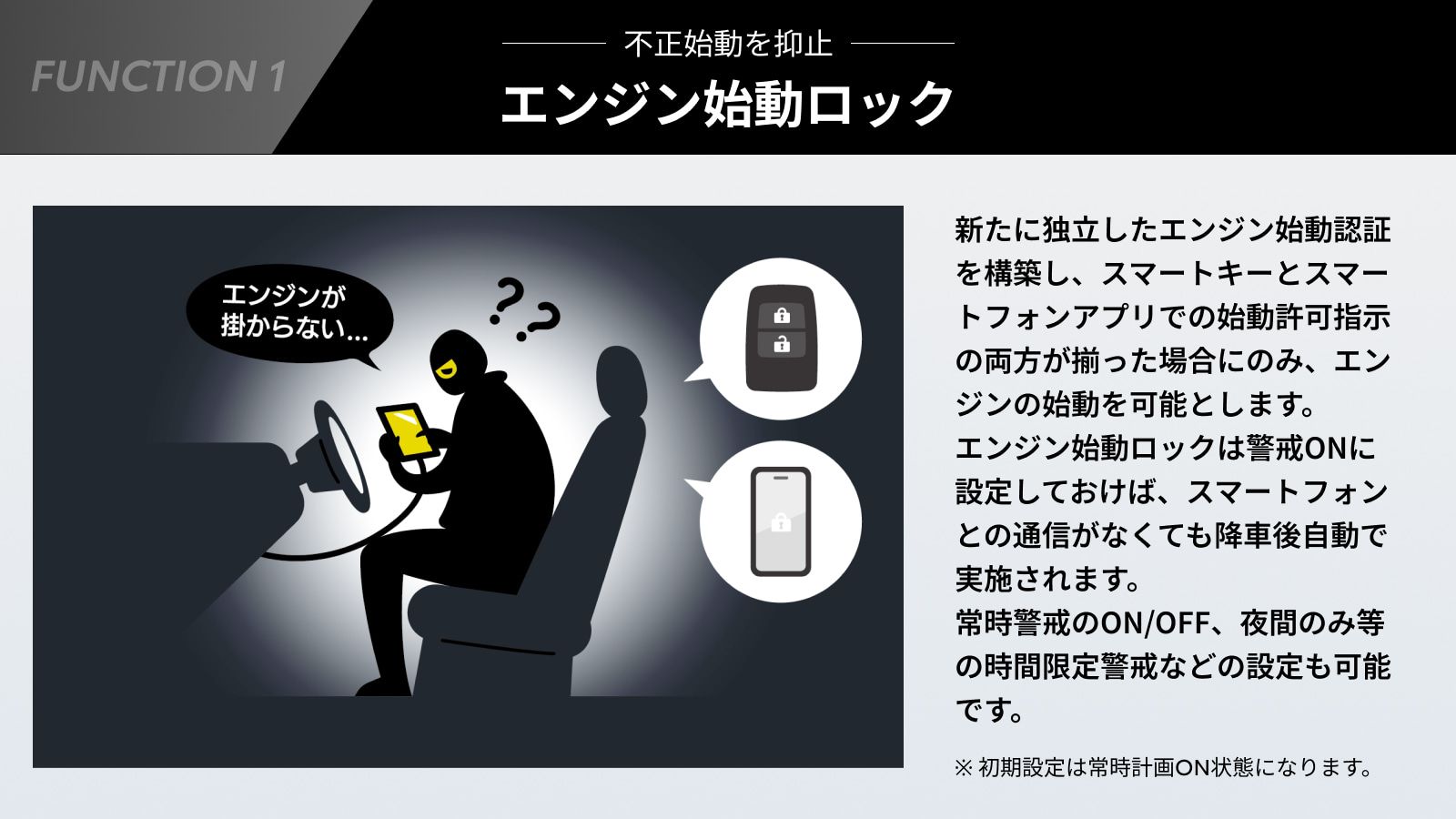 ※本製品は、セキュリティ性能を向上するものであり、盗難防止を保証するものではありません。 ※本製品のアプリに対応したスマートフォン【iOS 16.x以上またはAndroid 11.x以上】が必要です。事前にダウンロードのうえ、ご確認をお願いいたします。 ※セキュリティ警戒状態の場合、エンジン始動、HVシステム起動を伴う、その他の機能は車両純正機能※であっても、本製品アプリでの始動ロック解除操作が無ければご利用いただけないことがあります。 ※(例1)リモートスタート 利用前に、本製品アプリでの始動ロック解除が必要な場合があります。 ・ガソリン車、ディーゼル車:リモートスタート機能利用時に本製品アプリでの解除操作が必要です。 ・HEV、PHEV車:リモートスタート機能利用時に解除操作は不要です。 ※(例2)アドバンストパーク(出庫時) 利用前に本製品アプリでの始動ロック解除が必要です。