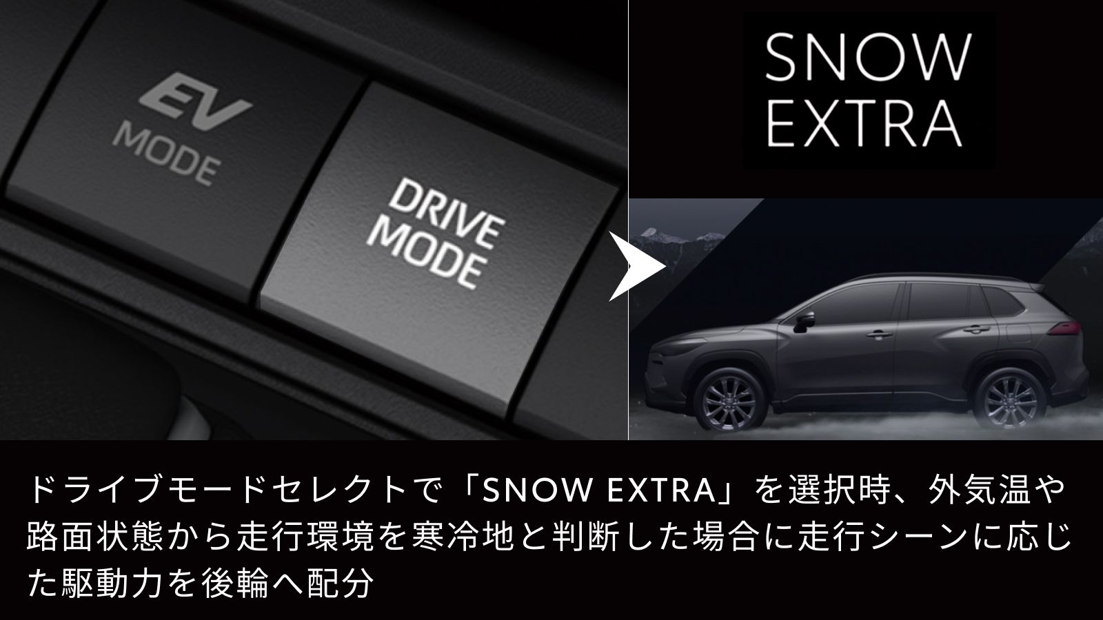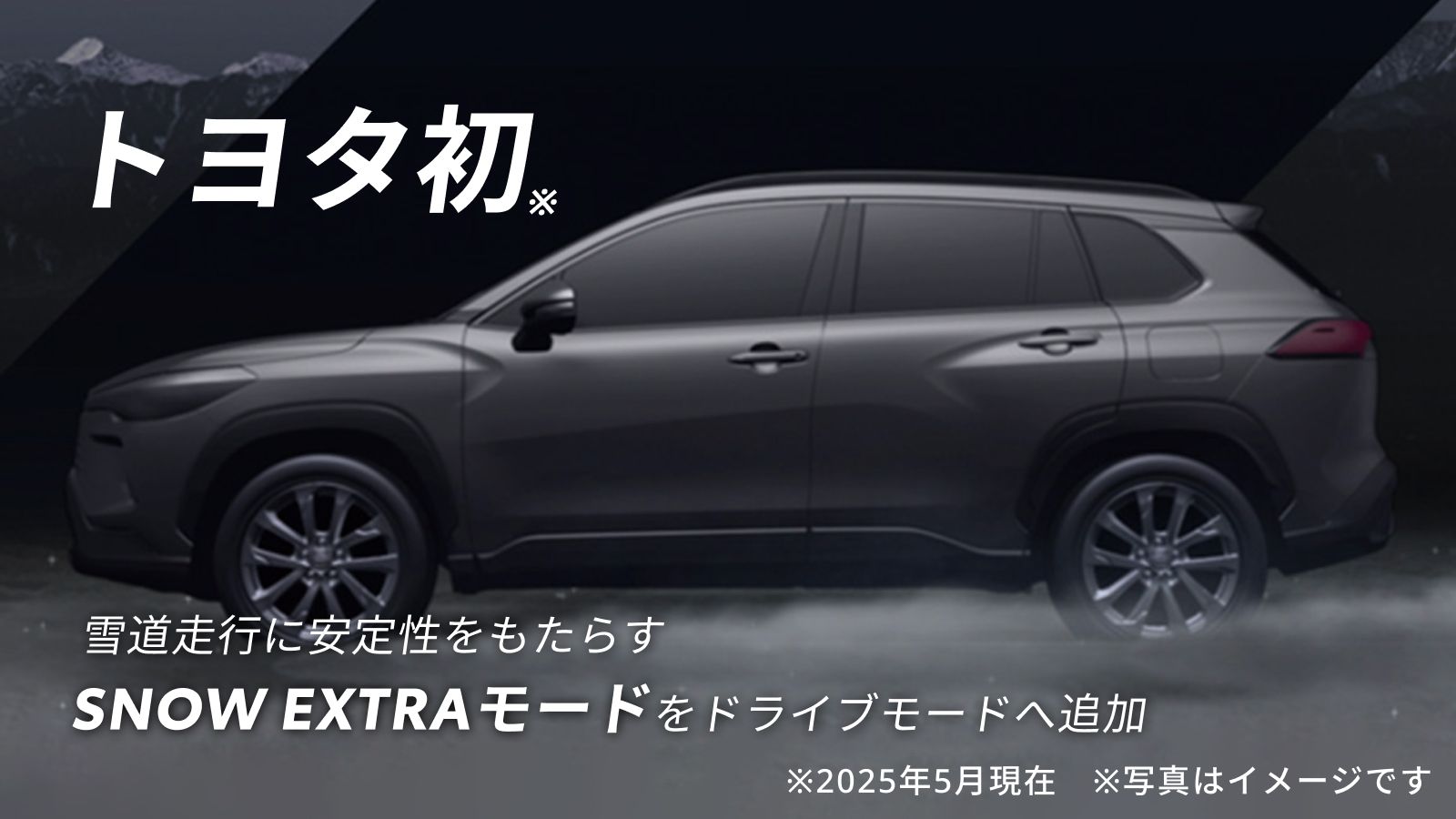 2023年10月~2025年4月に生産されたカローラクロス Zグレード(E-Fourのみ)を対象に、2025年5月発売のカローラ クロス一部改良モデルE-Four車に標準装備されている、雪道走行に安定性をもたらす【トヨタ初※】のSNOW EXTRAモードをドライブモードに追加します。 ドライブモードセレクトで「SNOW EXTRA」選択時、12.3インチTFTカラーメーター+マルチインフォメーションディスプレイに専用起動画面が表示されます。 ※2025年5月現在 <商品説明> ドライブモードセレクトで「SNOW EXTRA」を選択時、外気温や路面状態から走行環境を寒冷地と判断した場合に走行シーンに応じた駆動力を後輪へ配分。雪路でのさらなる走行安定性に貢献します。またアクセル開度に応じた減速トルクを後輪にも配分することにより、アクセルによる車両コントロール性の最適化を図ります。 本商品はソフトウェアアップデートにより短時間施工かつ、お求めやすい価格でのご提供を実現しました。 トヨタのメーカー保証が付くことに加え、取付をトヨタ販売店で行うため、安心してお使いいただけます。 本WEBサイトからお申込みいただくことで、取付工賃込みの専用価格にてご提供いたします(※価格は、税込、部品代、工賃込み)。