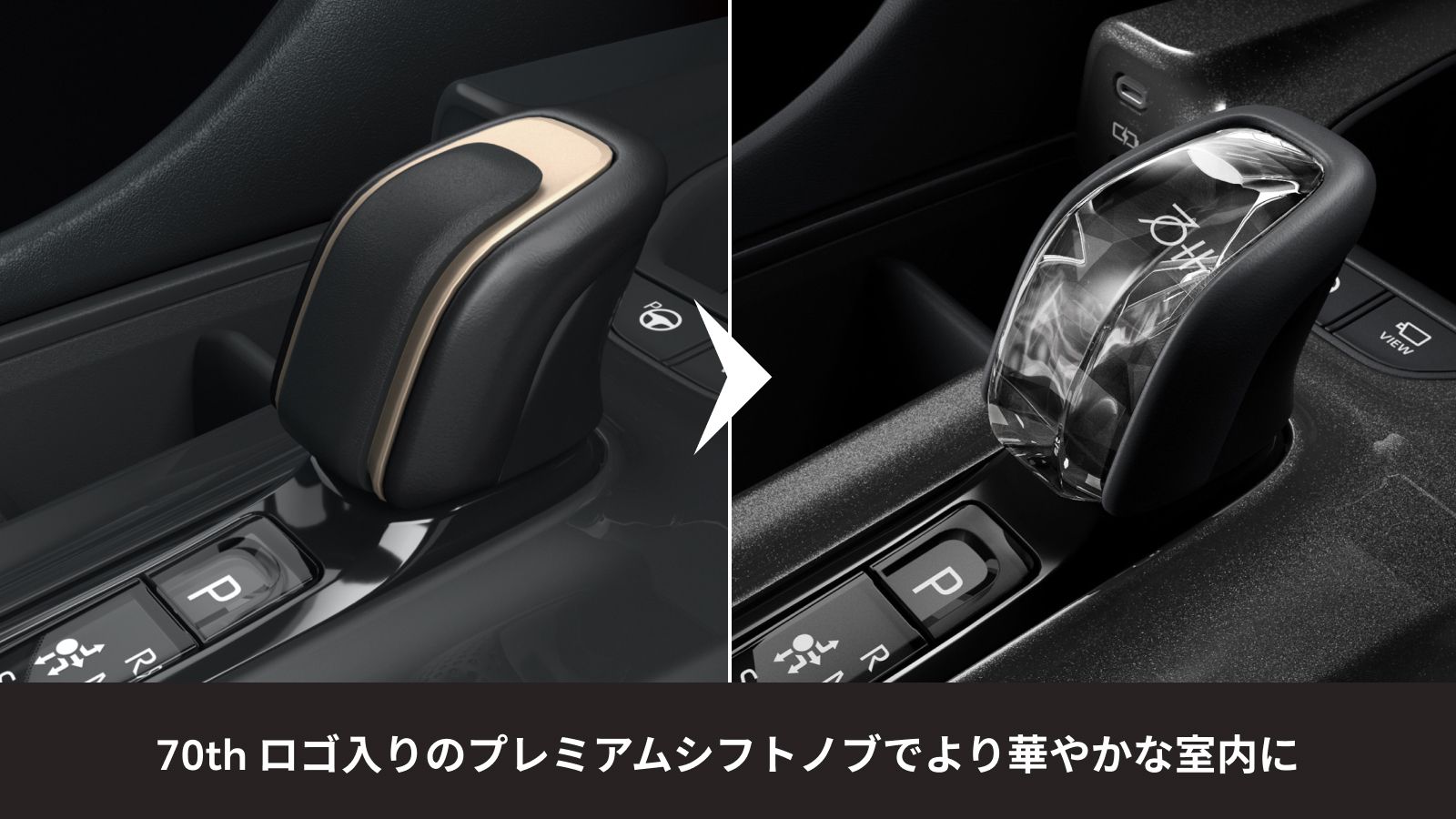 70thロゴ入りのプレミアムシフトノブで室内をより華やかに。