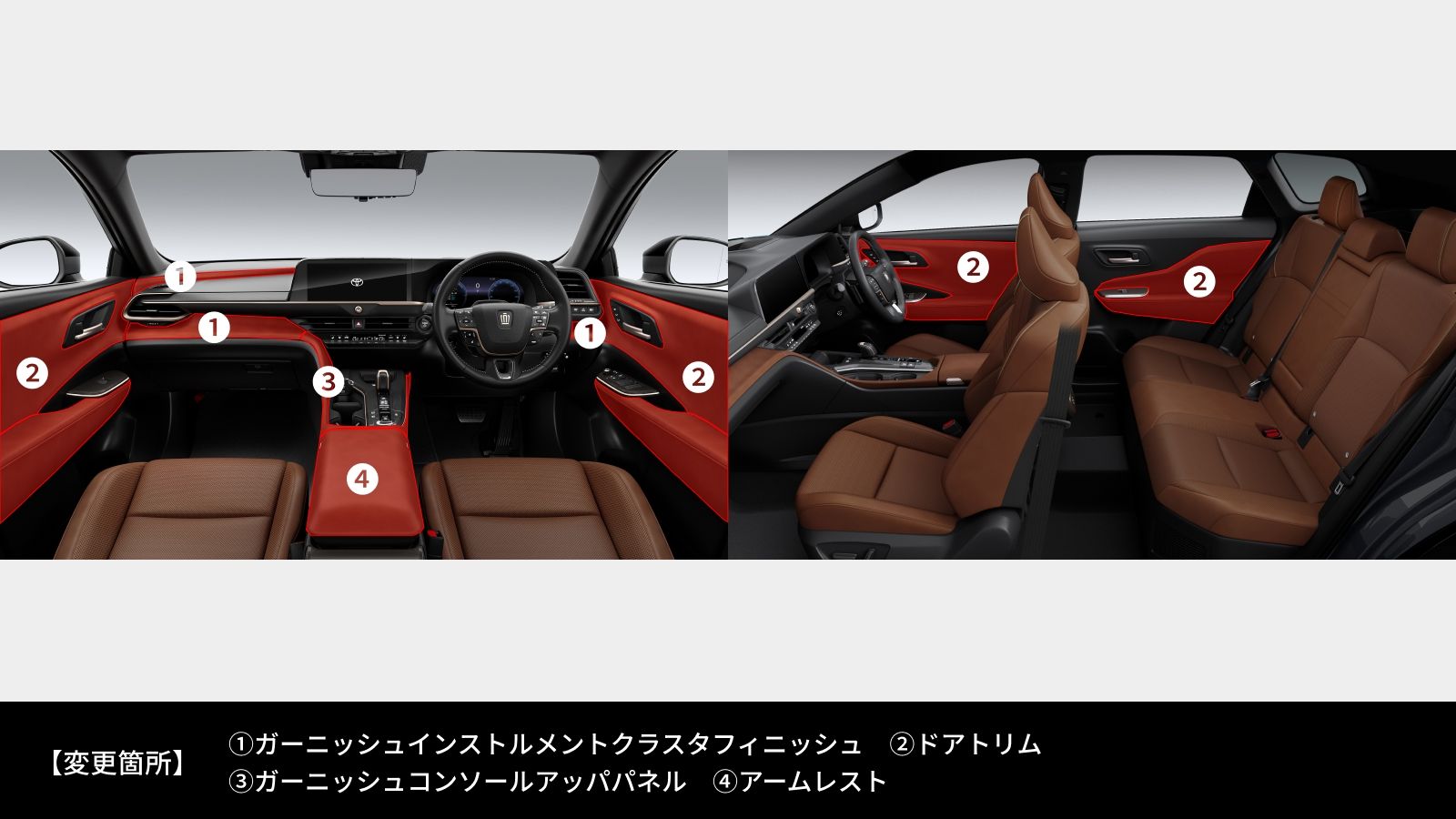 新車購入時とは異なるインテリアカラーへのカスタマイズをご提供致します。 インストルメントパネル、ドアトリムやコンソール周りの部品をブラックに変更することで、室内の印象に変化を加えることができます。 <主な変更箇所> ①インストルメントパネル ②コンソールアッパパネルガーニッシュ ③リヤコンソールアームレスト ④ドアトリムボード トヨタのメーカー保証が付くことに加え、取付をトヨタ販売店で行うため、安心してお使いいただけます。 本WEBサイトからお申込みいただくことで、取付工賃込みの専用価格にてご提供いたします(※価格は、税込、部品代、工賃込み)。