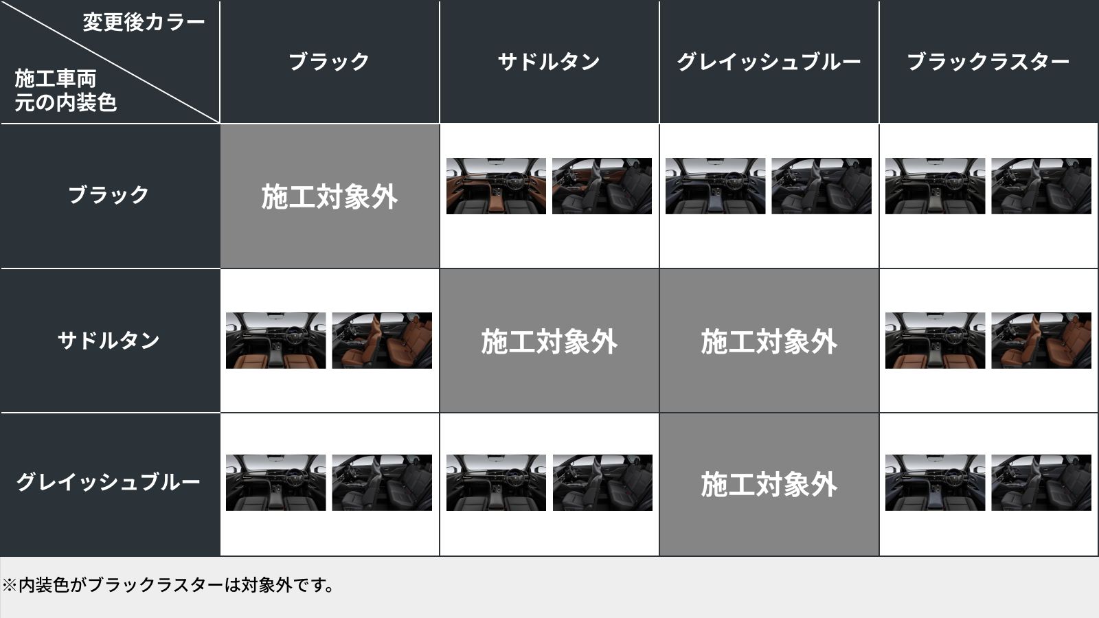 ※内装色がブラックラスターの車両については、ブラックへの変更は提供しておりません。ご了承ください。 ※写真はイメージです。実物と色が異なる場合があります。 ※本商品は内装の加飾を施す商品です。スイッチ部分等、再利用する部品が一部ございます。また、車両の仕様により交換する部品が異なる場合がございます。