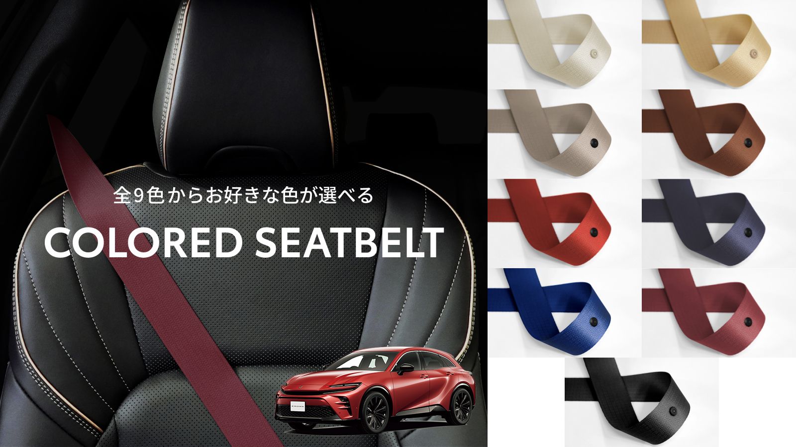 「カラードシートベルト」は、クラウンスポーツ(23年11月以降生産分)の全てのグレードを対象に、運転席・助手席のシートベルトを、アイボリー、メローホワイト、フォーン、サドルタン、レッド、ダークローズ、ブルー、ターコイズブルーおよびブラックの9色からお好みのカラーに交換するサービスです。