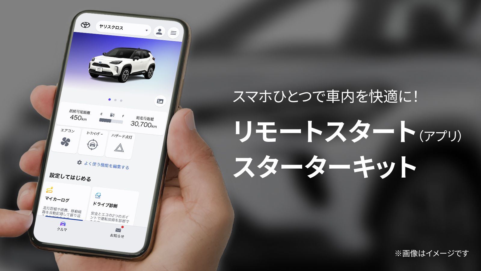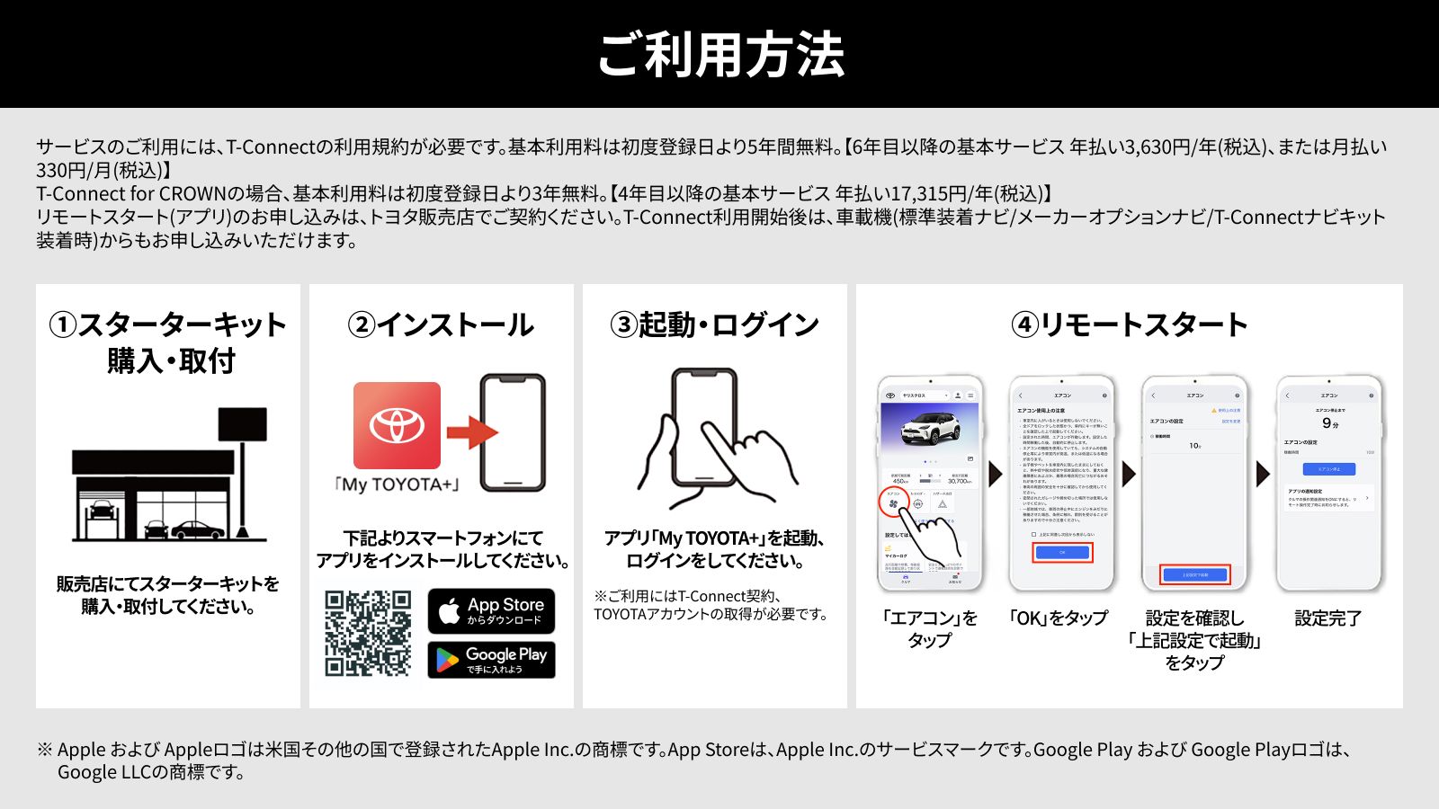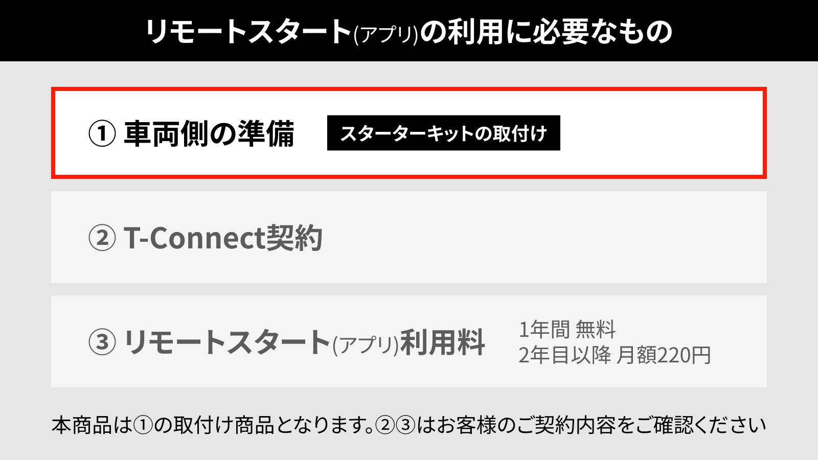 リモートスタート(アプリ)をご利用いただくには、本商品以外にT-Connect契約とリモートスタート(アプリ)利用料が必要になります。