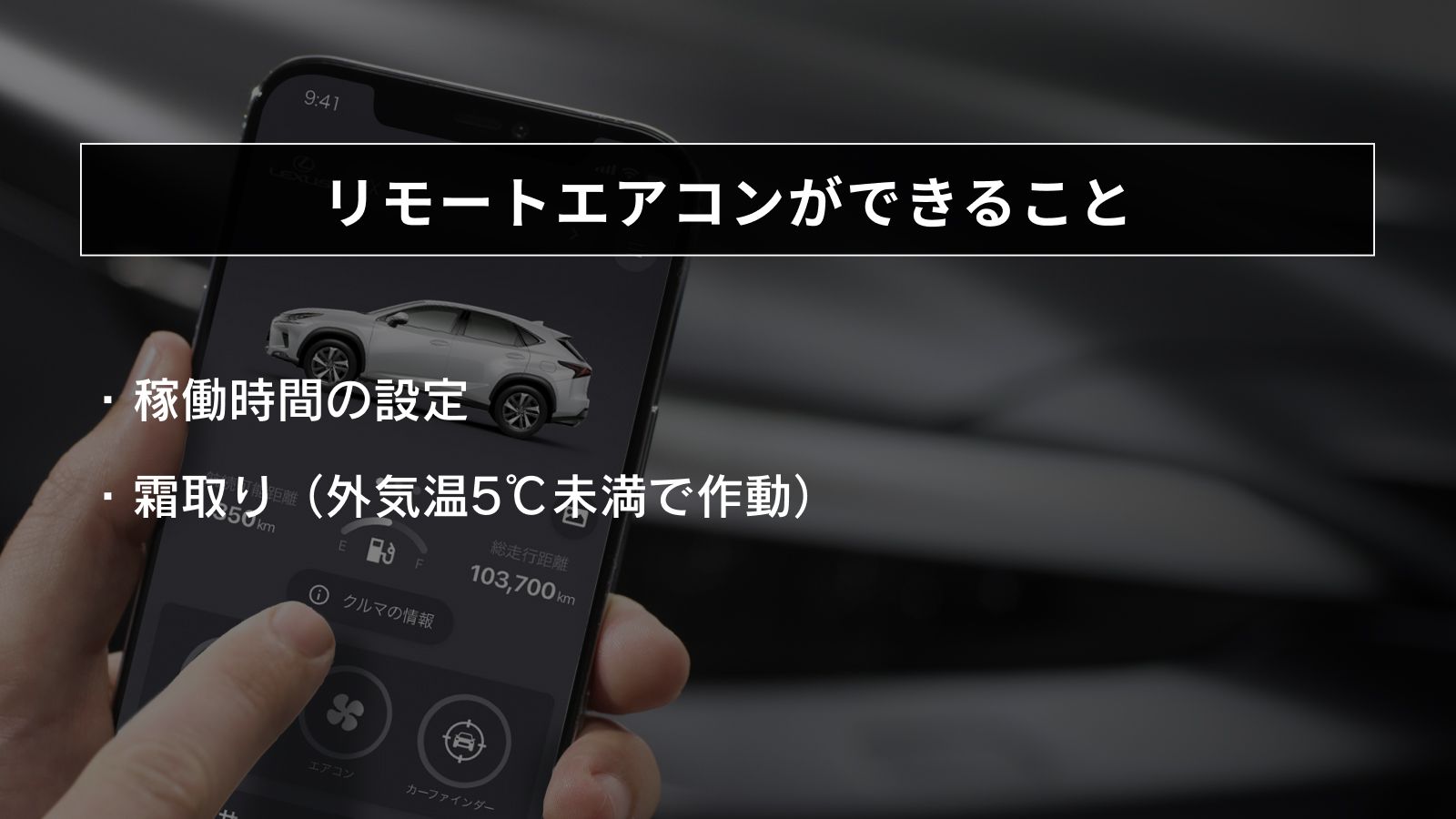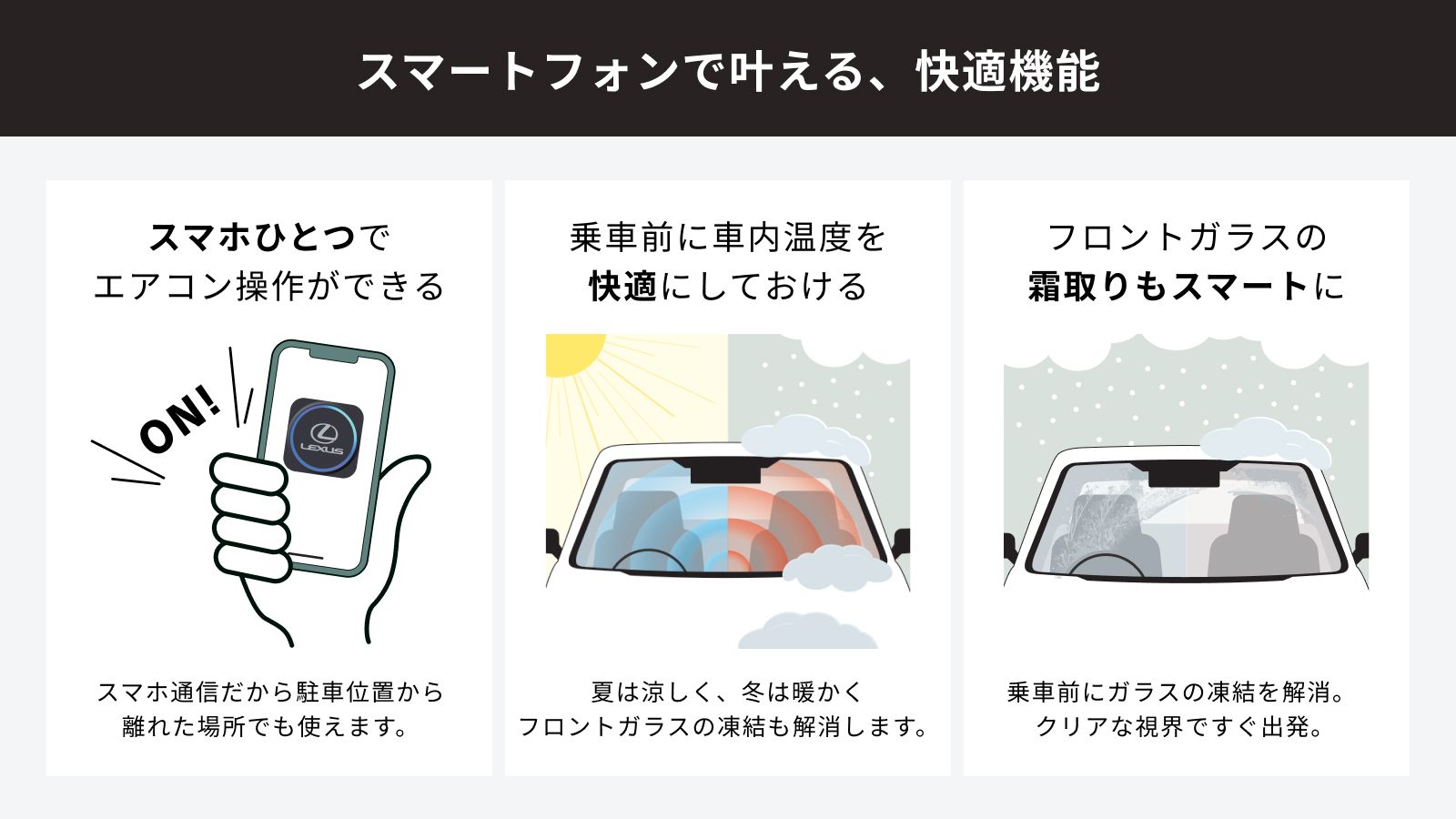 スマホ通信だから駐車位置から離れた場所からでも、車に乗る前に車内の温度を快適にしたり、凍結したガラスの霜取りができます。