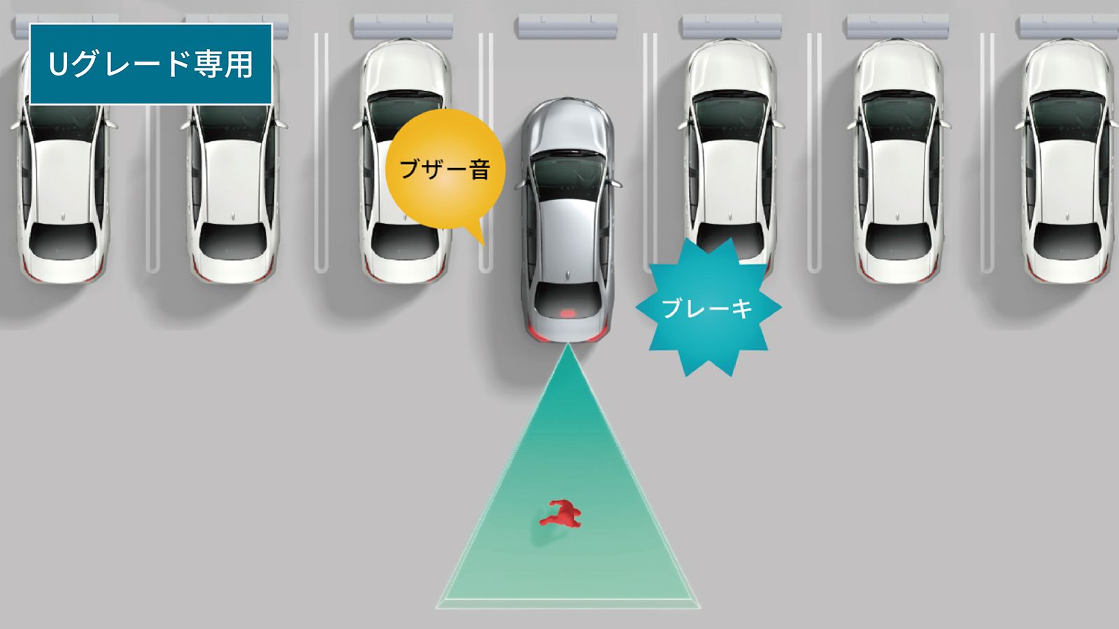 ※パーキングサポートブレーキは衝突被害軽減ブレーキまで働くシステムではありますが、必ず止まることを約束するものではありません。道路状況、車両状態および天 候状態等によっては作動しない場合があります。また、衝突の可能性がなくてもシステムが作動する場合もあります。詳しくは取扱書をご覧ください。 ※安全運転を行う責任は運転者にあります。常に周囲の状況を把握し、安全運転に努めてください。 ※ソナーおよびレーダー、カメラの検知範囲、作動速度には限界があります。必ず車両周辺の安全を確認しながら運転してください。 ※運転者自身でパーキングサポートブレーキの衝突被害軽減ブレーキ制御を試すことはおやめください。 ※パーキングサポートブレーキの衝突被害軽減ブレーキが作動した場合でもブレーキ制御は2秒で解除されるため、そのまま前進・後退できます。また、ブレーキペダルを踏んでもブレーキ制御は解除されるため、再度アクセルペダルを踏むことで前進・後退できます。 ※パーキングサポートブレーキ(後方歩行者)は、歩行者以外の立体物に対しても作動することがあります。ブレーキ作動後はブレーキを踏んで周囲の確認をお願いします。