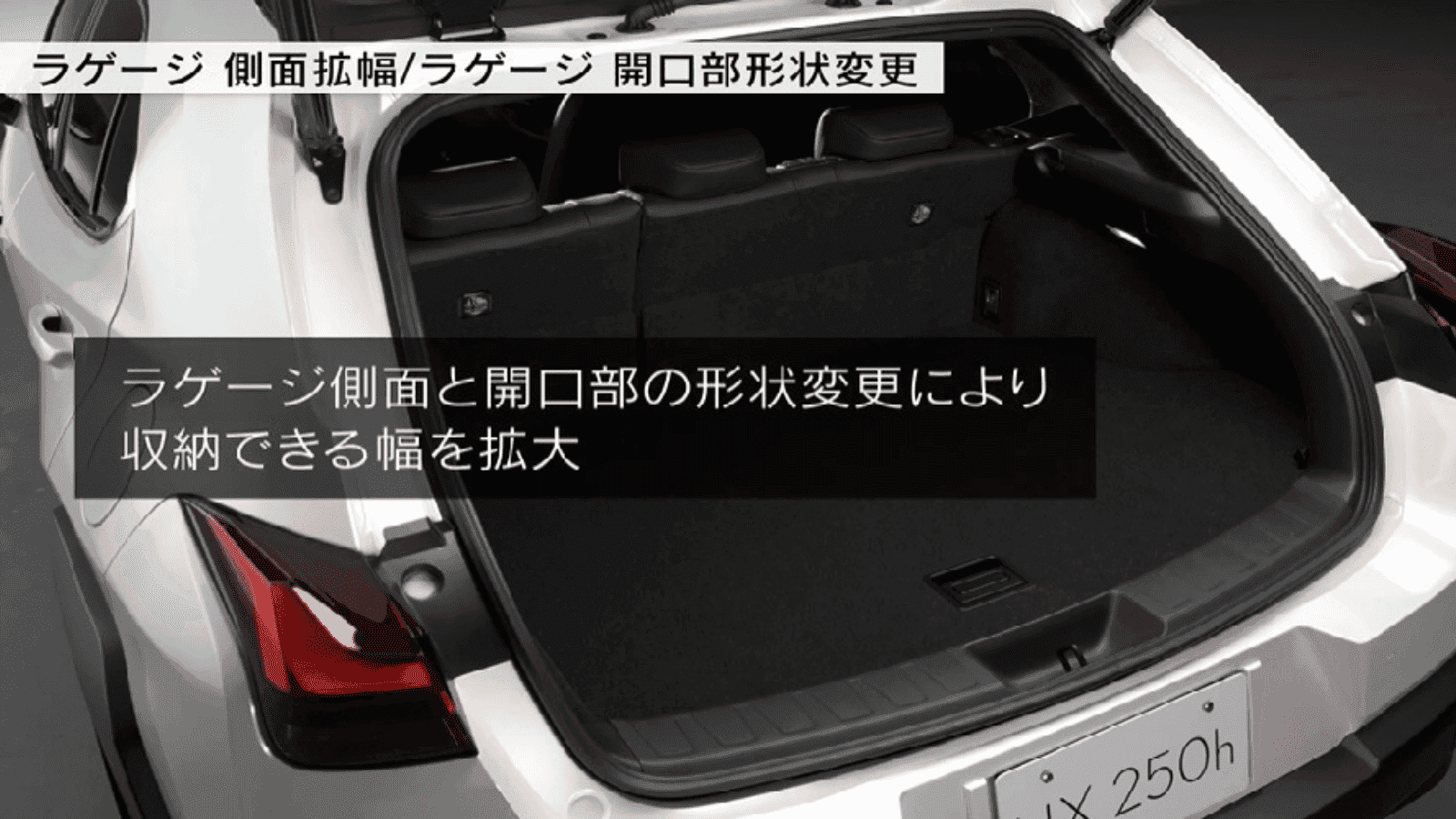 ※変更部位は、2段デッキタイプのラゲージに加えラゲージ側面拡幅及び開口部形状です。 ※スペアタイヤ装着車は対象外です。 ※2WD車で、アクセサリーコンセント(AC100V・1500W/非常時給電システム付[フロントセンターコンソールボックス後部・ラゲージルーム内])を装着している場合、デッキアンダーボックスの形状が異なります。 ※最大荷室容量268Lはデッキボード上部264L、アンダーデッキ4Lの合計です。 ※仕様によりアンダーデッキの容量が異なりますので、詳細につきましてはlexus.jpでご確認ください。 ※容量はVDA方式で測定。 ※写真はUX250h "version C"。 ※ラゲージトレイ、ラゲージマット、ロングラゲージマットをご利用中の場合、ローデッキ用、2段デッキ用は形状が異なりますのでご注意ください。