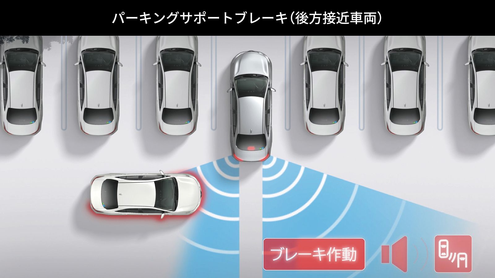 ※パーキングサポートブレーキは衝突被害軽減ブレーキまで働くシステムではありますが、必ず止まることを約束するものではありません。道路状況、車両状態および天 候状態等によっては作動しない場合があります。また、衝突の可能性がなくてもシステムが作動する場合もあります。詳しくは取扱書をご覧ください。 ※安全運転を行う責任は運転者にあります。常に周囲の状況を把握し、安全運転に努めてください。 ※ソナーおよびレーダー、カメラの検知範囲、作動速度には限界があります。必ず車両周辺の安全を確認しながら運転してください。 ※運転者自身でパーキングサポートブレーキの衝突被害軽減ブレーキ制御を試すことはおやめください。 ※パーキングサポートブレーキの衝突被害軽減ブレーキが作動した場合でもブレーキ制御は2秒で解除されるため、そのまま前進・後退できます。また、ブレーキペダルを踏んでもブレーキ制御は解除されるため、再度アクセルペダルを踏むことで前進・後退できます。